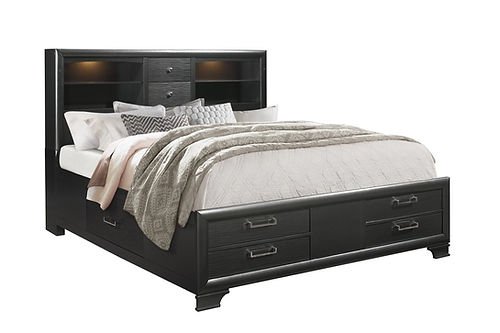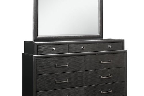 Lots of features and functionality are smartly tucked away in this modern classic bedroom group. Between the storage headboard, under-bed drawers and tall, 9 drawer dresser, it’s easy to keep your room a showplace. With Grey lacquer finish on carved drawer fronts and Nickel hardware to complete the look.