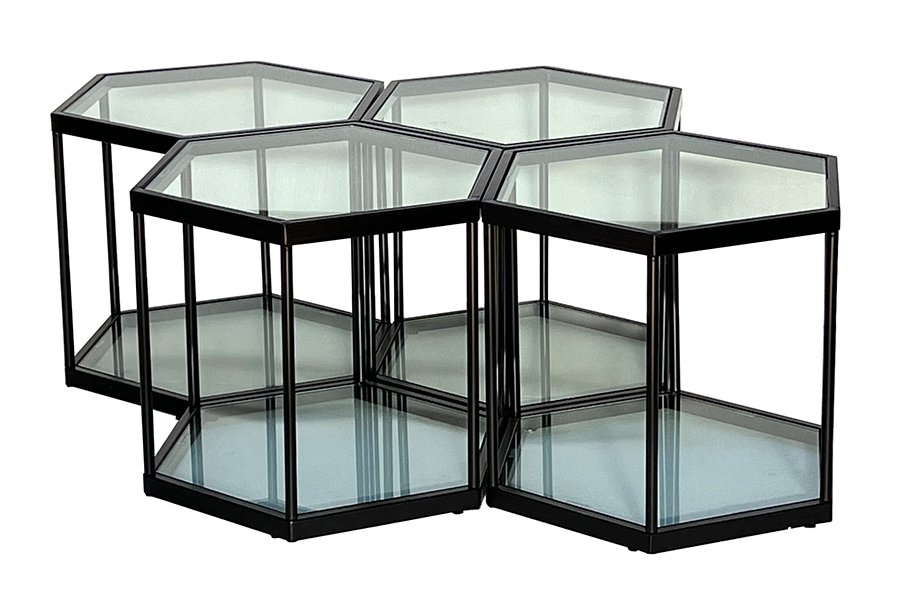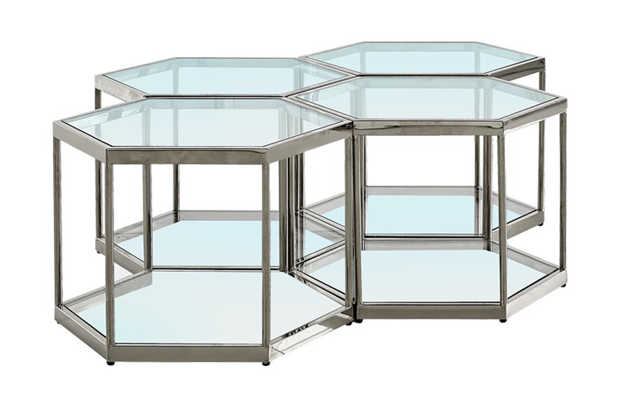 Silver or Gold Stainless Steel BaseBlack Metal Powder Coated BaseSet of Four Tables Two Tempered Clear Glass Tops
