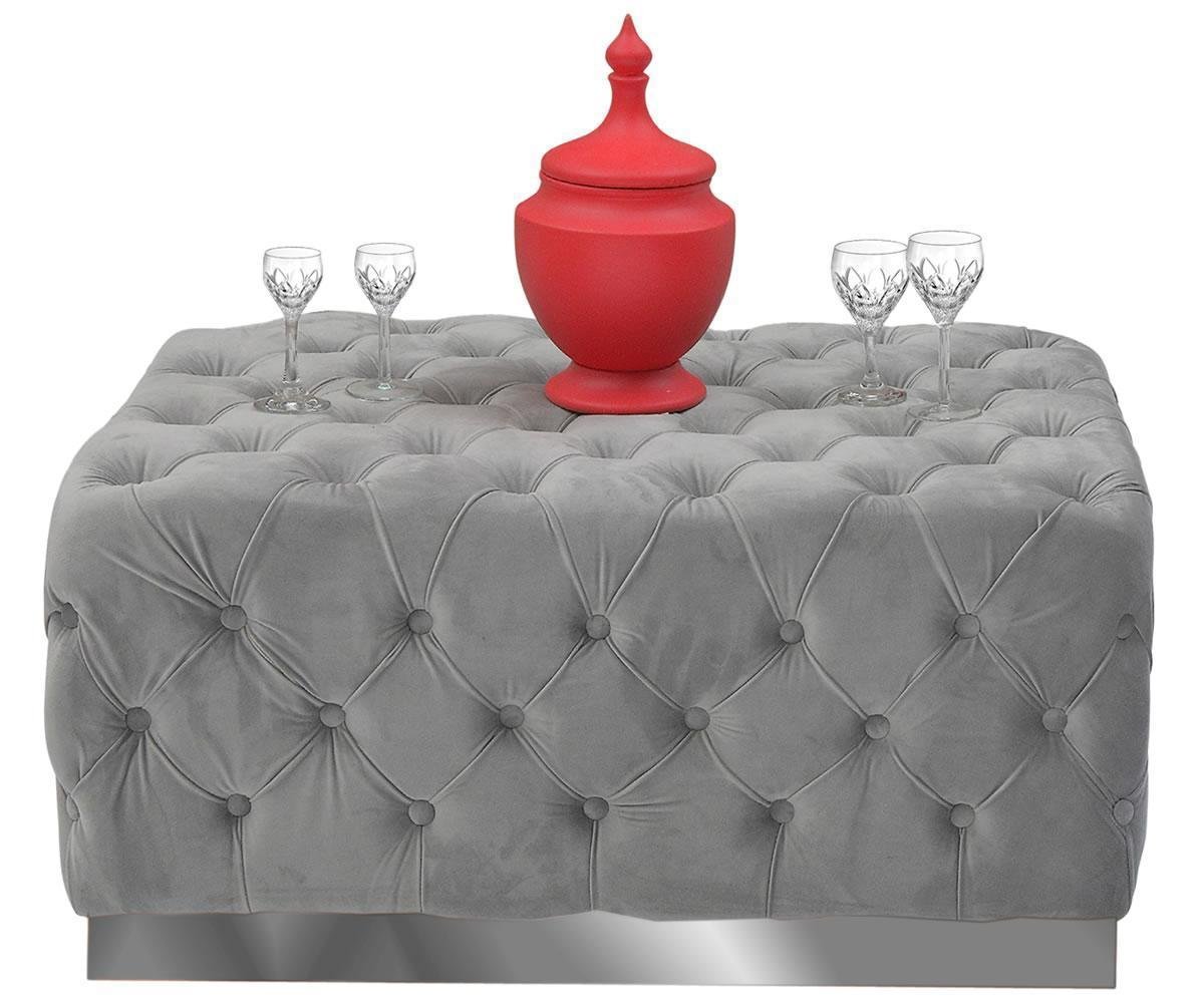 Grey Color Ottoman. Portia ottoman is perfect piece as extra seating for an impromptus get-together or as a stylish accent piece.Key Features:Chrome-toned stainless steel base comes together with rich, velvety upholsteryTufted style and button finish of the ottoman adds extra elegance Silver frame adds a touch of sophisticationThick fabric padded seating ensures comfort