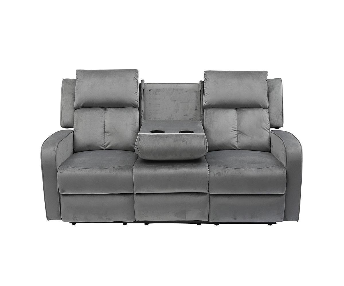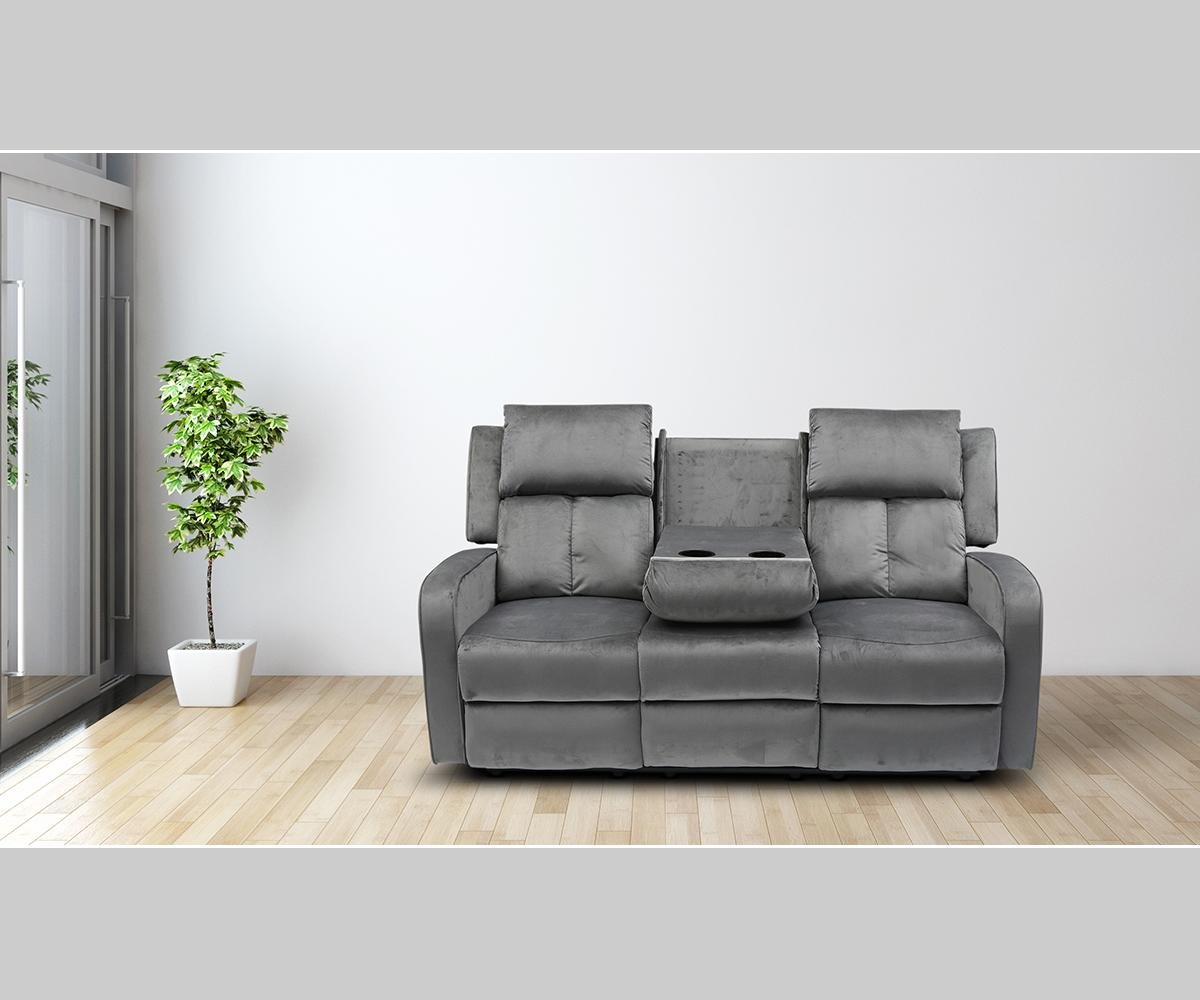 Your quest for a comfortable and yet stylish living room sofa comes to an end.Key Features:Functionality, comfort and style combine together in this recliner sofaThe back of the middle seat of the sofa drops down into convenient tray with cup holders.Upholstered with comfy, durable and breathable velvet fabric